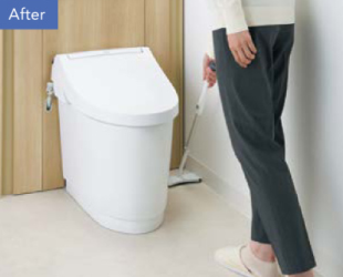 日常のお掃除は、手の届きやすいカウンターまわりを拭くだけ。手の届きにくい便器奥をキャビネットで隠して、カンタンお掃除。床もお掃除モップでラクラクお掃除。