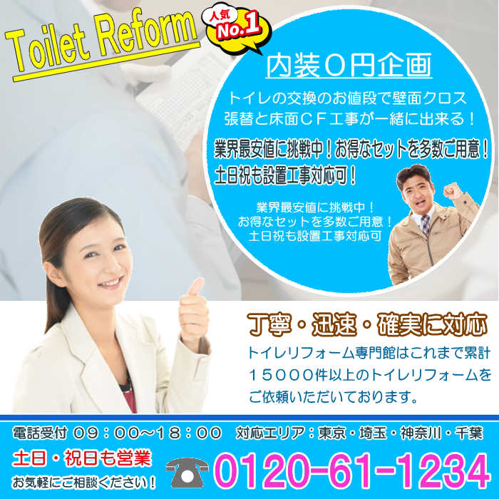 埼玉・さいたま市北区で人気の「トイレの内装0円企画」は無料でトイレの内装をリニューアル企画です。初めてトイレリフォームを検討している方や、安くまるごとトイレリフォームをお考えの方に最適